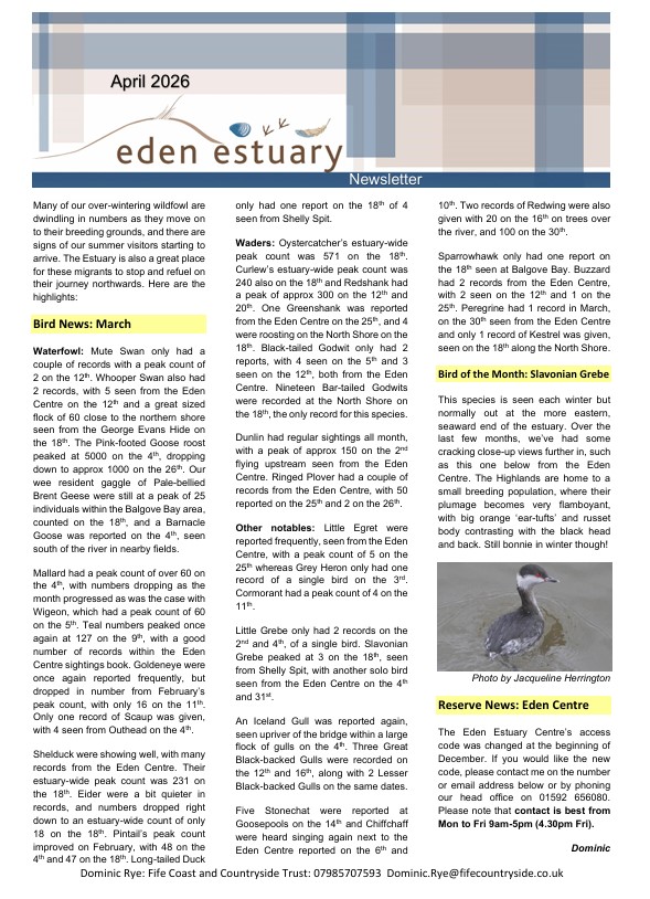 Read the April edition of the Eden Estuary newsletter. Please remember that the code for the centre recently changed, so contact us during office hours to get the new one.