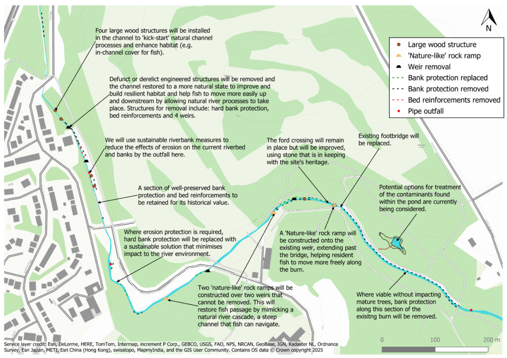 The Back Burn has seen many changes over time due to its industrial heritage. Such changes have unfortunately impacted the health of the burn and surrounding environment. Historical modifications include artificial bed and bank protection, channel straightening and a series of weirs that pose barriers to fish migration. Many benefits can be derived from restoring watercourses to a more natural condition. Restoration helps to: